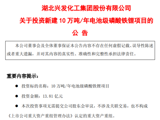4月4日,兴发集团发布公告,为进一步完善公司新能源产业布局,丰富产品种类,提升新能源产业市场影响力和综合竞争力,公司全资孙公司内蒙古兴发科技有限公司拟投资13.81亿元,建设10万吨/年电池级磷酸铁锂项目。